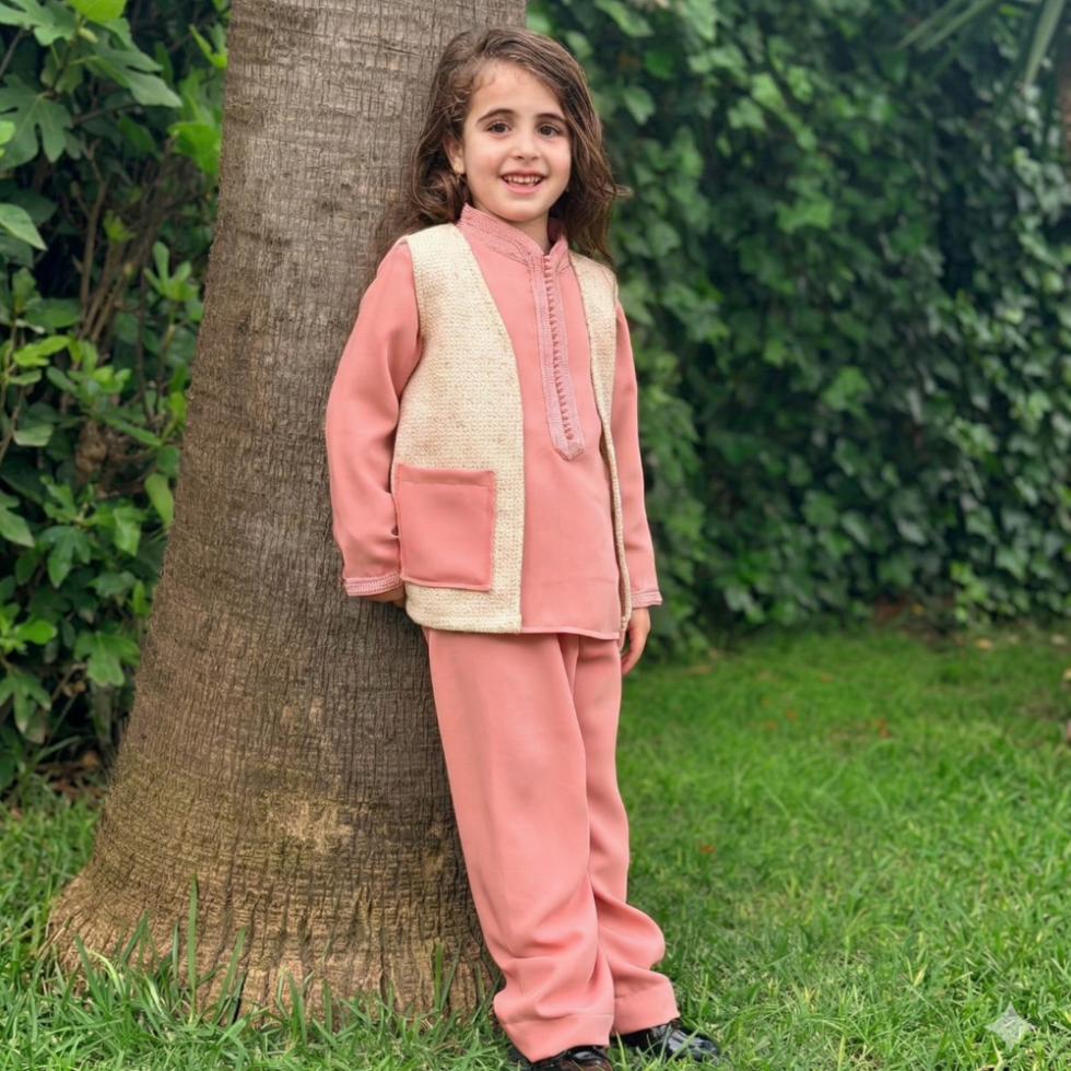 Jabador 3 pieces – Crêpe de Soie & Gilet Tweed peche et blanc casse