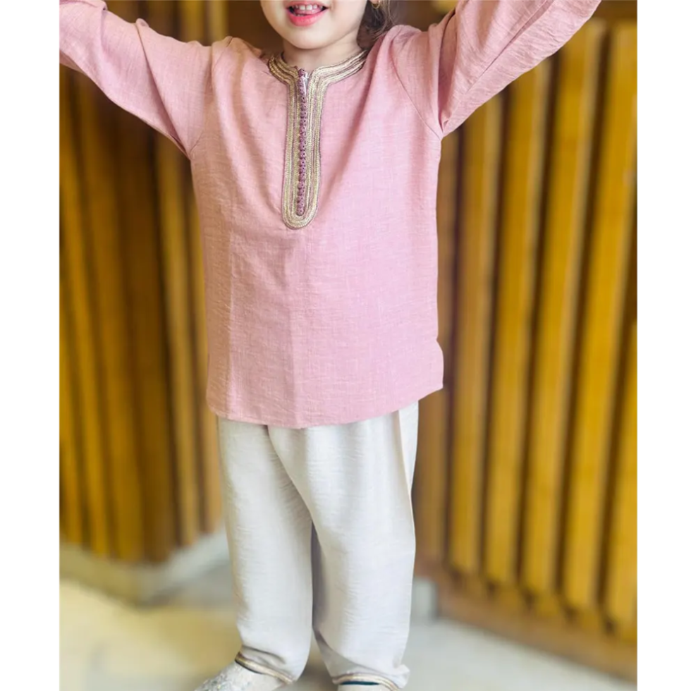 Jabadour deux pièces pour fille en lin rose & beige, parfait pour les occasions spéciales.