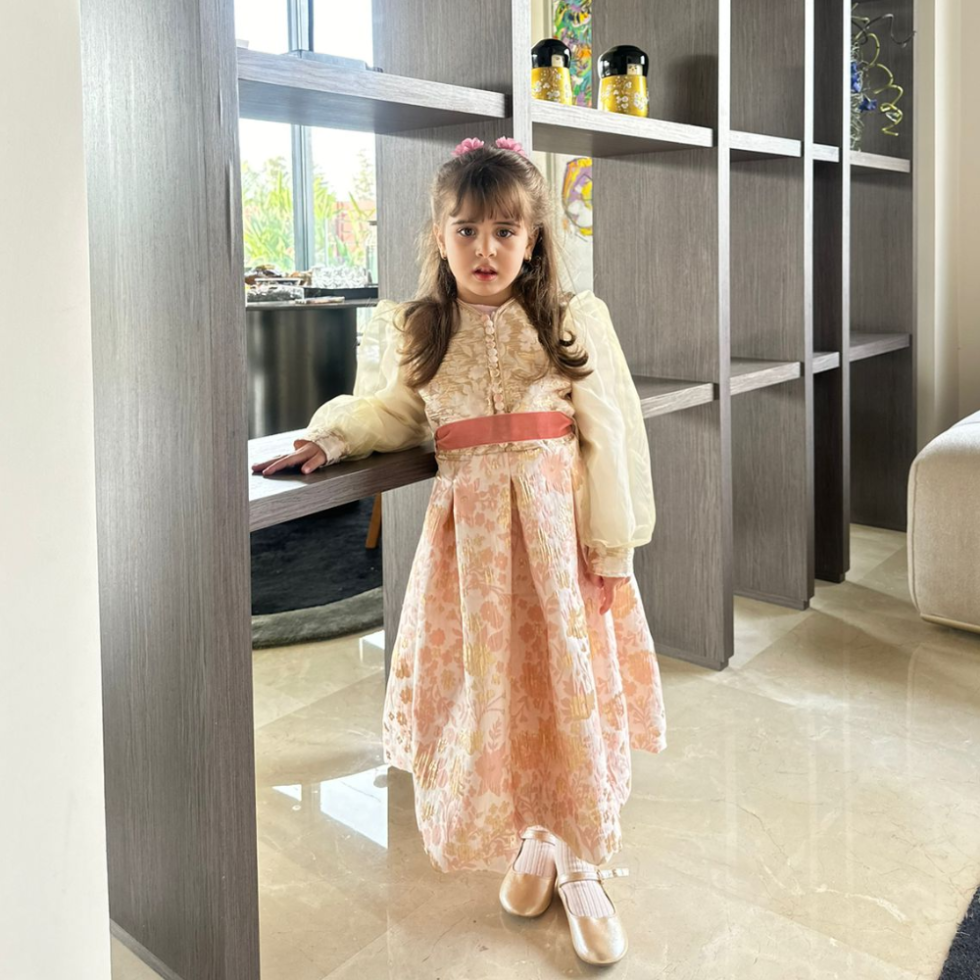Robe caftan en brocard et organza rose bébé