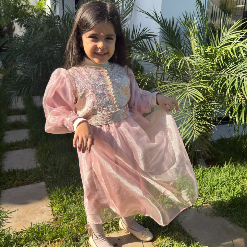 * Matières Nobles : Buste en broché de soie rose et or, associé à des manches et un jupon vaporeux en organza.